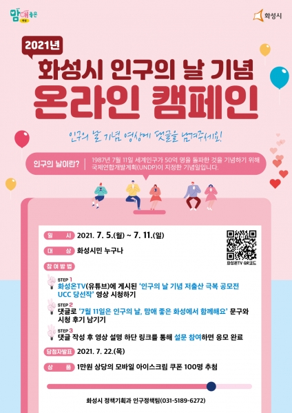 [충청뉴스큐] 화성시가 인구의 날을 맞아 5일부터 오는 11일까지 온라인 캠페인을 벌인다.