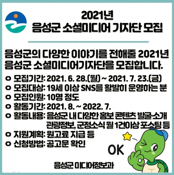 [충청뉴스큐] 충북 음성군은 지역 관광지와 축제 등을 SNS로 홍보하는 2021년 음성군 소셜미디어 기자단을 오는 23일까지 모집한다고 밝혔다.