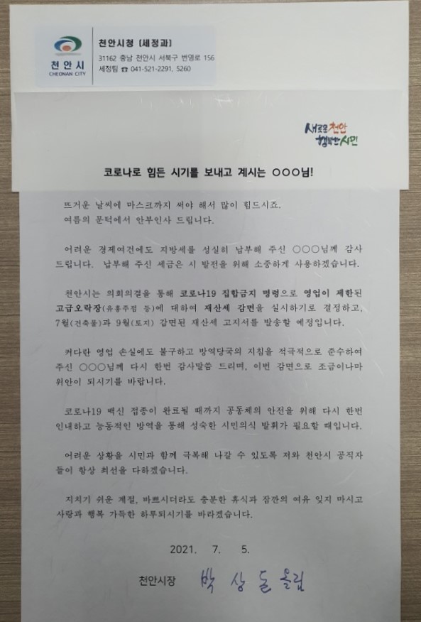 [충청뉴스큐] 천안시는 유흥주점 등 고급오락장 재산세 감면시행과 관련 해당 부동산 소유자와 고급오락장 영업주에게 지난 5일 서한문을 발송했다고 밝혔다.