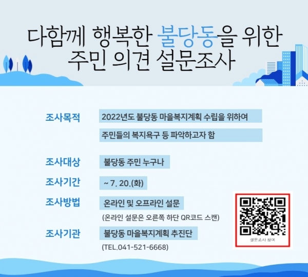 [충청뉴스큐] 천안시 불당동이 7월 20일까지 2022년도 마을복지계획 수립을 위한 주민욕구조사를 실시한다고 밝혔다.