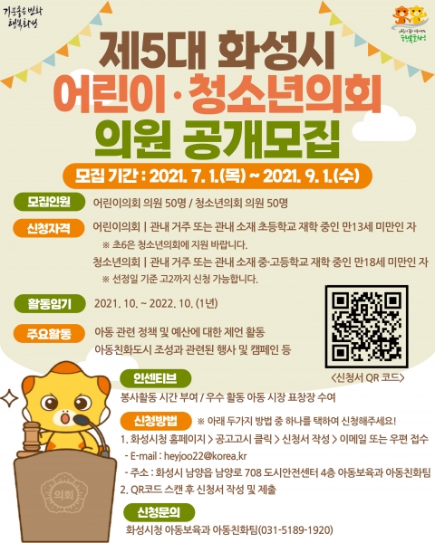 [충청뉴스큐] 화성시가 제5대 화성시 어린이·청소년의회 의원을 공개모집한다고 밝혔다.
