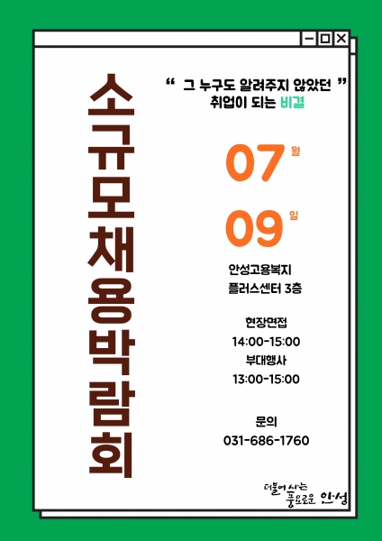 [충청뉴스큐] 안성시는 오는 9일 안성고용복지플러스센터에서 ‘2021 안성맞춤 소규모 채용박람회’를 개최한다고 밝혔다.