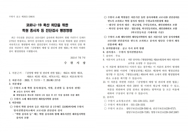 [충청뉴스큐] 수원시가 7일 관내 학원 종사자를 대상으로 ‘코로나19 확산 차단을 위한 학원 종사자 등 진단검사 행정명령’을 내렸다.