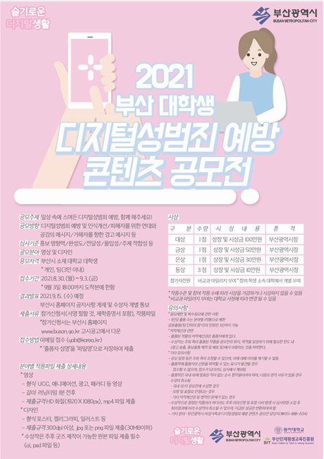 [충청뉴스큐] 부산시는 시 대학협력단 지역사회 상생·협력 지원사업인 ‘디지털성범죄 예방 대학생 서포터즈단’을 운영하는 동아대학교와 공동으로 ‘2021 부산 대학생 디지털성범죄 예방 콘텐츠 공모전’을 개최한다고 밝혔다.