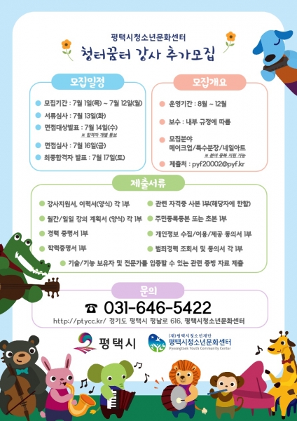 [충청뉴스큐] 평택시 위탁기관인 평택시청소년문화센터는 진로체험 활동 공간 ‘청터꿈터’의 청소년진로체험 1개 분야 3개 강좌의 전문 강사를 오는 12일까지 추가로 모집한다.