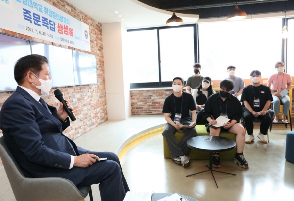이날 자리는 “청년자립, 청년성공, 청년행복”을 주제로 6개 키워드를 중심으로 학생이 즉석에서 질문하고 시장이 바로 답변하는 즉문 즉답 방식으로 진행했다.