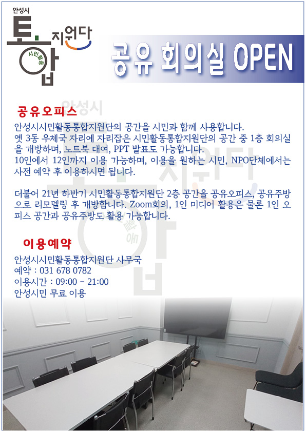 이번에 시민들에게 개방하는 공유회의실은 지원단 건물 1층에 위치하며 노트북과 대형 TV 등을 무료로 사용할 수 있고 최대 12인까지 이용 가능하다.