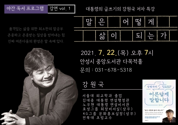 안성시 중앙도서관은 오는 22일 저녁 7시 중앙도서관 다목적홀에서 ‘말은 어떻게 삶이 되는가?’를 주제로 강원국 작가의 강연을 개최한다고 밝혔다.