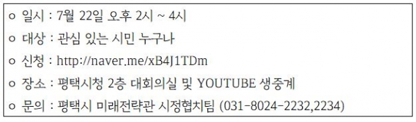 [충청뉴스큐] 평택시는 오는 22일 오후 2시에 평택시청 2층 대회의실에서 제8회 평택시 협치 아카데미를 개최한다고 밝혔다.