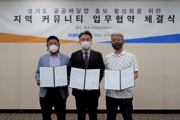 경기도주식회사는 8일 판교 스타트업캠퍼스에서 군포시 맘카페 산사모, 한국외식업중앙회, 소상공인연합회와 배달특급 홍보 활성화를 위한 지역 커뮤니티 양해각서를 체결했다고 밝혔다.