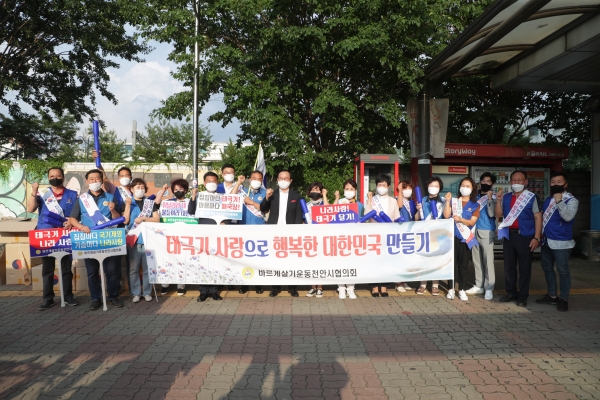 이번 행사는 박상돈 시장과 바르게살기 임원 및 여성위원회 회원 20여명이 참석한 가운데 천안역 서부광장에서 현수막, 피켓, 어깨띠를 매고 전단지와 가정용 태극기를 나눠주며 태극기 달기 운동을 홍보했다.