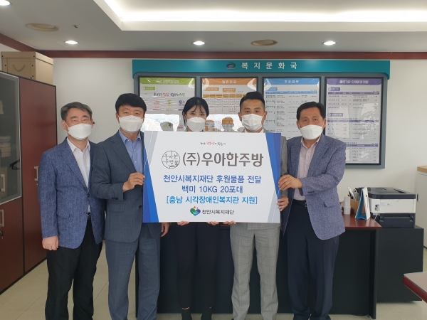 [충청뉴스큐] ㈜우아한주방은 지난 8일 천안시 취약계층 지원을 위해 백미 10Kg을 천안시복지재단에 전달했으며 이날 후원된 백미는 충남시각장애인복지관에 전달될 예정이다.