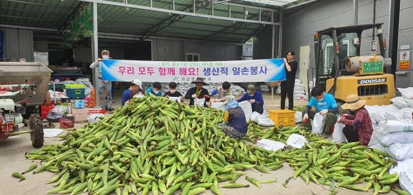 이날 재무과 직원 15명이 사회적 거리두기 방역수칙 준수 하에 옥수수 선별과 포장작업 등을 하며 인력난을 겪고 있는 농가에 힘을 보탰다.