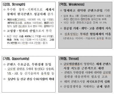 게임, 만화, 영화·드라마, 음악 등 한국의 콘텐츠산업은 우수한 창작·기획력을 바탕으로 세계시장에서 크게 성공한 사례를 만들고 있고, 산업적으로도 고성장·고부가가치 산업으로서 그 중요성이 크게 부각되고 있다. 특히, 세계적 플랫폼의 영향력 확산, 5세대 통신의 상용화, 가상현실·증강현실 등 신기술의 발전과 함께 콘텐츠의 무한 경쟁과 수요 증가가 가속화될 것으로 분석되고 있다.