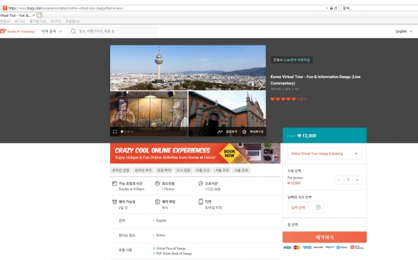 대구시는 온라인 라이브랜선투어 상품이 판매가 잘 될 수 있도록 하나투어아이티씨와 협업 및 지원체계를 구축해 온라인 개별여행객 여행플랫폼인 케이케이데이, 트레이지, 비아터, 에어비앤비의 홍보 채널을 적극 활용해 랜선여행 상품 판매를 유도할 계획이라고 전했다.