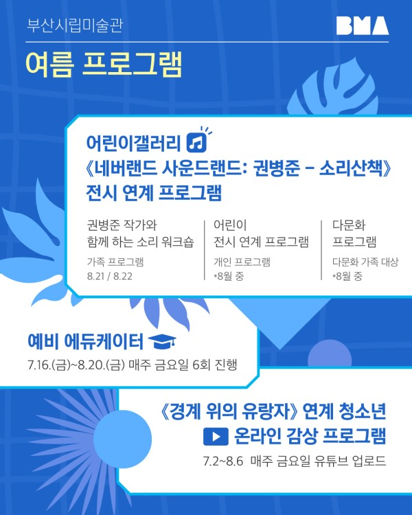 기혜경 부산시립미술관 관장은 “코로나19 시대 국내외 여행이 자유롭지 못한 시민들이 여름방학을 의미 있게 보낼 수 있도록, 다양한 전시와 연계한 예술 체험프로그램을 계속해서 기획·운영할 것”이라고 전했다.