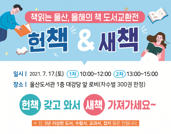 [충청뉴스큐] 울산도서관은 7월 17일 울산도서관 1층 대강당 로비에서 ‘2021년 책읽는 울산, 올해의 책 도서 교환전’으로 ‘헌책 & 새책’을 개최한다.