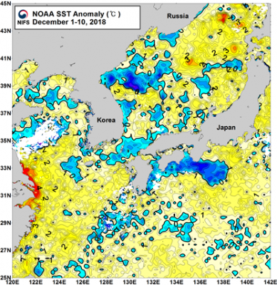 저수온 주의보는 내년 1월 초?중순부터 서해 연안 및 남해 내만으로 확대될 것으로 예상된다.