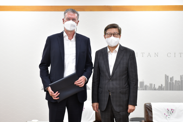 디어크 루카트 주한유럽상공회의소 회장은 박형준 부산시장의 취임을 축하하며 그간 주한유럽상공회의소의 주요활동을 소개하고 한국과 EU의 우호적 관계 지속과 더불어 앞으로 부산과의 경제 협력관계의 중요성을 강조했다.