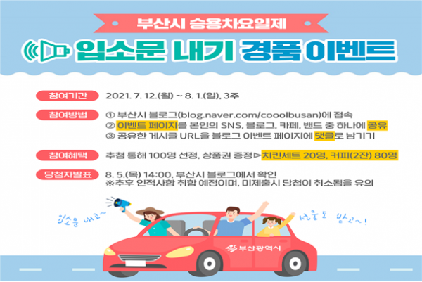 부산시는 2030 젊은 세대의 승용차요일제 신규가입을 독려하기 위해 오는 8월 1일까지 온라인을 활용한 ‘승용차요일제 입소문 내기 이벤트’를 실시한다고 밝혔다.