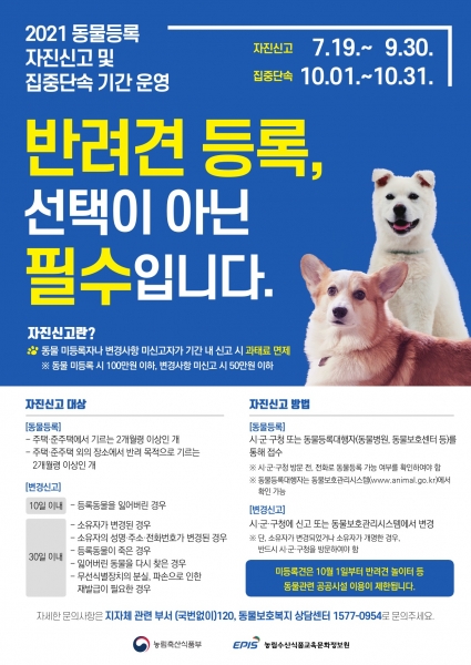 이번 자진신고기간 내 반려동물을 신규로 등록하거나 변경사항을 신고하면 미등록 및 변경신고 지연에 따른 과태료가 면제된다.