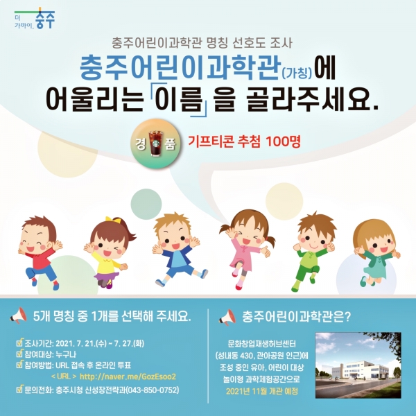 [충청뉴스큐] 충주시가 21일부터 오는 27일까지 충주어린이과학관의 이름을 정하기 위해 ‘과학관 명칭 선호도 조사'를 실시한다.