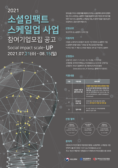 [충청뉴스큐] 부산시는 소셜임팩트 분야 우수 스타트업, 소셜벤처 기업을 발굴하고 성장 및 투자유치를 지원하기 위해 ‘2021년 소셜임팩트 스케일업 사업’참여기업을 오는 8월 15일까지 모집한다고 밝혔다.