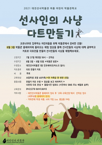 [충청뉴스큐] 대전선사박물관은 7월 27일부터 초등학생을 대상으로 한 온라인 교육 프로그램 2021년 대전선사박물관 어린이 박물관학교 ‘선사인의 사냥 : 다트만들기’를 운영한다고 밝혔다.