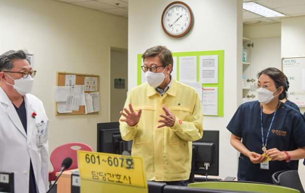 [충청뉴스큐] 박형준 부산시장은 7월 26 오후 1시 20분부터 부산의료원, 부산시 제3생활치료센터를 잇따라 방문해 최근 코로나19 확산에 따른 방역 대응 현장을 점검하고 폭염속에 근무중인 일선 의료진과 종사자를 격려했다.