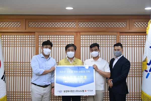 [충청뉴스큐] 논산시는 27일 농업회사법인 ㈜나나팜 공병윤 대표가 시청을 방문해 코로나19로 어려움을 겪고 있는 시민들을 위해 써달라며 4천만원 상당의 손소독제 1만개를 기탁했다고 전했다.