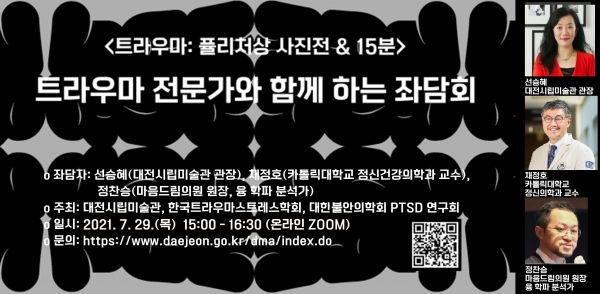 [충청뉴스큐] 대전시립미술관은 7월 29일 오후 3시부터 한국트라우마스트레스학회, 대한불안의학회 PTSD 연구회와 공동 기획한 ‘트라우마 전문가와 함께하는 좌담회’온라인으로 개최한다고 밝혔다.