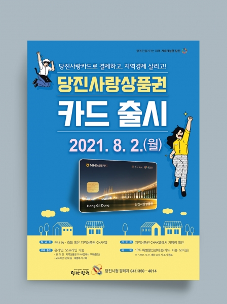8월부터 발급이 가능한 카드형 당진사랑상품권은 지역의 농·축협을 방문하거나 지역상품권 스마트폰 앱인 ‘지역상품권 CHAK’을 통해 신청할 수 있으며 관내 당진사랑상품권 가맹점 중 NH카드 가맹업소에서 사용 가능하다.