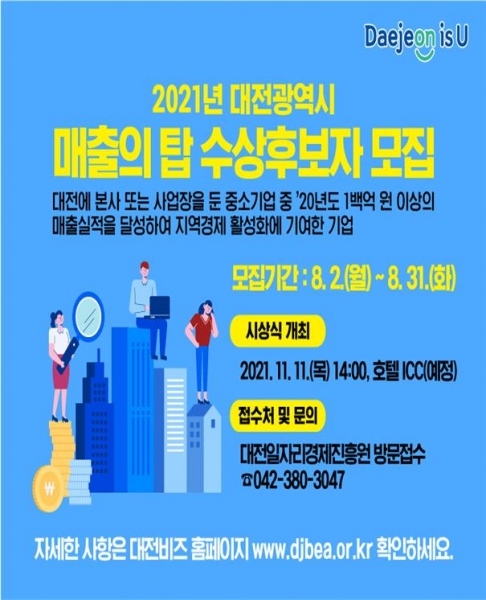[충청뉴스큐] 대전시가 지역경제 활성화에 기여한 ‘2021년 제15회 매출의 탑 수상기업 및 유공근로자’선정을 위해 8월 2일부터 31일까지 대상 기업과 근로자를 모집한다.