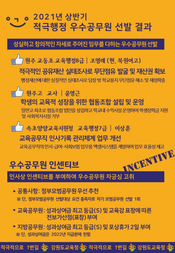 이번에 선발된 적극행정 우수공무원은 원주 북원여고 주무관 조영래, 원주고 교사 윤영근, 속초양양교육지원청 주무관 이상훈이 선발됐다.