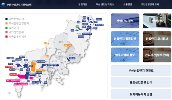 부산 산업단지 지원시스템에서는 산업단지 현황 입주기업체 정보 분양정보, 입주업체 설문조사 기능, 각종 통계자료 등 다양한 정보를 제공하고 있어, 부산지역 산업단지 내 입주 의향이 있는 기업체 등이 부산지역 산단의 공장입지정보를 원스톱으로 확인할 수 있다.