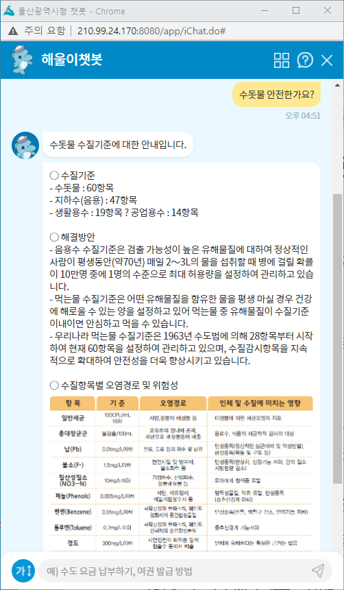 챗봇 : 채팅과 로봇의 합성어로 인공지능 기반 대화형 메신저 서비스 앞서 울산시는 지난 3월~ 7월 차량등록, 상수도, 여권 등 3개 분야에 대해 ‘챗봇 민원 상담 시스템’을 구축하고 8월 중 내부 직원을 대상으로 시험 운영을 거칠 예정이다.