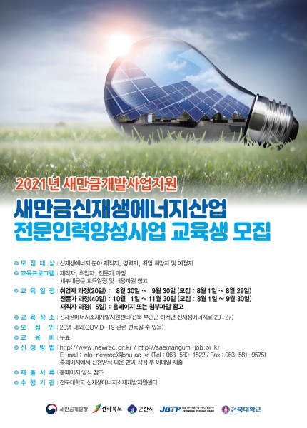 [충청뉴스큐] 군산시는 육상태양광 연말 상업운전 등 새만금 3GW 규모의 재생에너지 발전사업이 본격화됨에 따라, 새만금산단 재생에너지 전문인력 수요에 대응하고 유지보수 인력 양성을 위한 신재생에너지 전문인력 교육생을 모집한다고 5일 밝혔다.