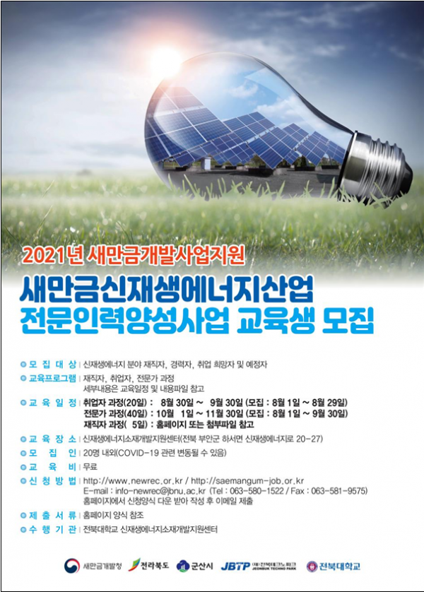 교육 참여에 관한 자세한 사항은 새만금 신재생에너지산업 전문인력양성센터 누리집과 신재생에너지소재개발지원센터를 활용하면 된다.