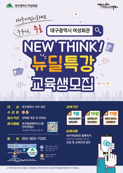 [충청뉴스큐] 대구시 여성회관은 포스트 코로나 시대를 선도할 여성인재양성을 위해 2021년도 제3기 교육생을 8월 9일부터 8월 11일까지 모집한다.