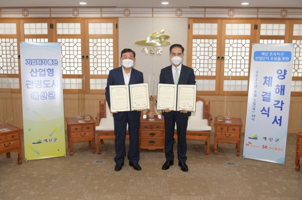 [충청뉴스큐] 예산군은 지난 5일 군청 상황실에서 SK에코플랜트와 예산군이 함께하는 신암 조곡지구 신규 산업단지 조성을 위한 양해각서를 체결했다.