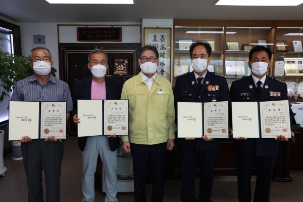 이날은 영동군산불예방진화대 김용호·민윤식, 추풍령전담의용소방대 현정호 대장, 매곡전담의용소방대 김규열 대장이 혁혁한 공을 인정받아 영예로운 표창을 받았다.
