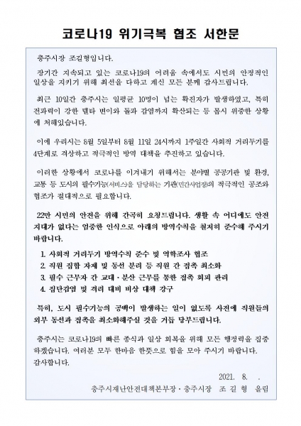 서한문에는 최근 10일간 일평균 10명이 넘는 확진자가 발생하고 있고 전파력이 강한 델타변이와 돌파감염까지 확산되는 등 몹시 위중한 상황임을 설명하며 시민 생활과 밀접한 공공서비스 기능 유지의 중요성을 강조했다.