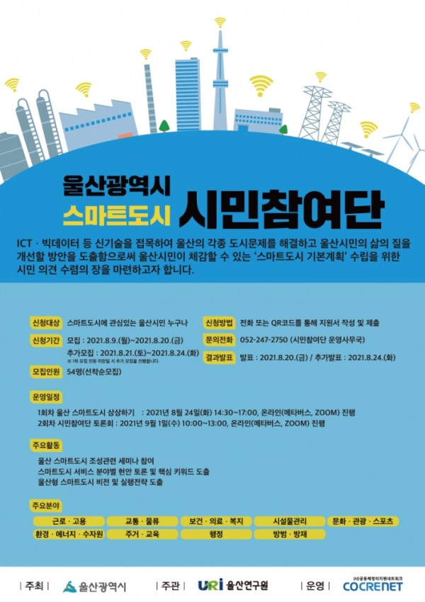 [충청뉴스큐] 울산시는 ‘스마트도시 기본계획 수립’을 위한 시민들의 의견을 수렴하고자 ‘스마트 도시 시민참여단’을 모집한다고 밝혔다.