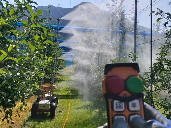 ‘과수 스마트 운반기 + 방제기’개발은 강원 과수농가의 경영 규모 중 1ha 미만의 소규모 과수원이 90.5% 차지하고 있고 이들 과수 농가의 효율성을 높이고자 맞춤형 방제기를 개발했고 특히 고령·여성 농업인 등 누구나 쉽게 과수 방제 작업 및 농자재·수확과실 운반이 쉽다.