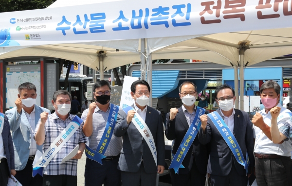 [충청뉴스큐] 김영록 전라남도지사는 코로나19 장기화와 고수온 피해까지 겹치면서 많은 어려움을 겪는 전복 양식어가를 위해 10일 목포역 앞에서 ‘전복 소비촉진 판매행사’ 홍보활동을 펼쳤다.