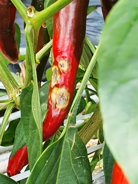 탄저병은 주로 비가 올 때 땅에 있는 병원균이 고추에 튀어 빠르게 퍼지는 치명적인 병균이다.