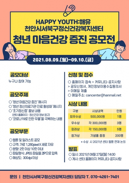 정범수 센터장은 “공모전을 통해 청년들의 마음건강 증진의 중요성이 확산되고 정신질환 및 정신건강복지센터에 대한 인식이 제고될 수 있는 계기가 되길 바란다”고 말했다.