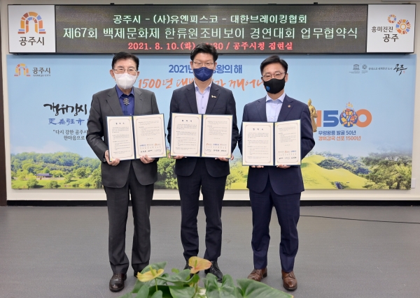 공주시는 지난 10일 시청 집현실에서 UN피스코 김덕룡 이사장과 대한브레이킹협회 정경태 회장이 모인 가운데 한류원조 백제와 대한민국 비보이의 상생발전을 위한 업무협약을 맺었다.