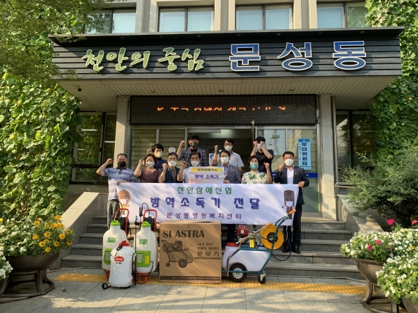 [충청뉴스큐] 천안시 문성동은 천안삼애신협이 지난 11일 지역 내 소독을 위해 방역소독기를 후원했으며 최계호 문성동주민자치위원장과 함께 행정복지센터에서 전달식을 진행했다고 밝혔다.