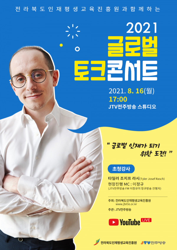 유튜브를 통해 온라인 방송으로 진행될 이 토크콘서트는 오는 8월 16일 오후 5시 JTV전주방송 채널에서 라이브 방송으로 진행 예정이며 강사와 실시간 소통을 통해 학생들과 질의응답도 있다.